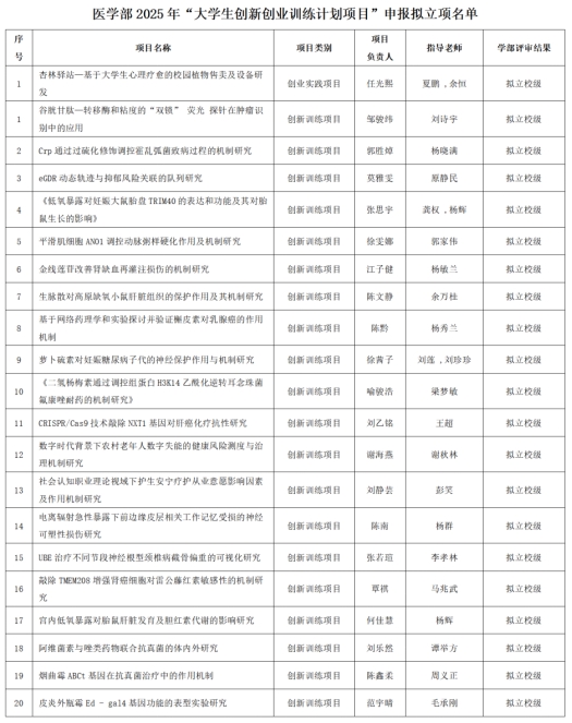 2025年suncitygroup太阳集团学生共申报大学生创新创业训练计划项目49项,经过学生汇报答辩、专家评审,拟推荐邹骏纬负责、刘诗宇老师指导的《谷胱甘肽—转移酶和粘度的“双锁” 荧光 探针在肿瘤识别中的应用》等21项申报校级大创项目。具体名单如下:
