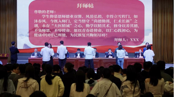 研究生拜师仪式上,研究生新生代表向研究生导师行拜师礼并献上拜师帖,全体研究生新生庄严宣誓,遵训存志,以仁心赴使命。